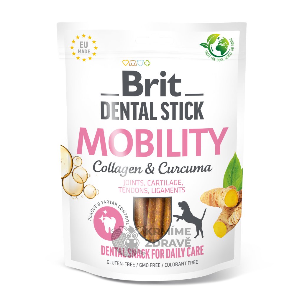 Brit Dog Dental Stick Mobility Curcuma & Collagen spojují dentální péči se zdravím pohybového aparátu. Díky kombinaci kolagenu, kurkumy, glukosaminu a mikrořas podporují pevnost kloubů, chrupavek, šlach a vazů, zatímco hexametafosforečnan sodný a máta pomáhají chránit zuby před tvorbou zubního kamene a osvěžují dech. Tyčinky jsou vyrobené z přírodních ingrediencí, neobsahují lepek, sóju, GMO ani barviva a jejich obal je plně recyklovatelný. Skvělá volba pro každodenní žvýkání a prevenci zubního kamene.
