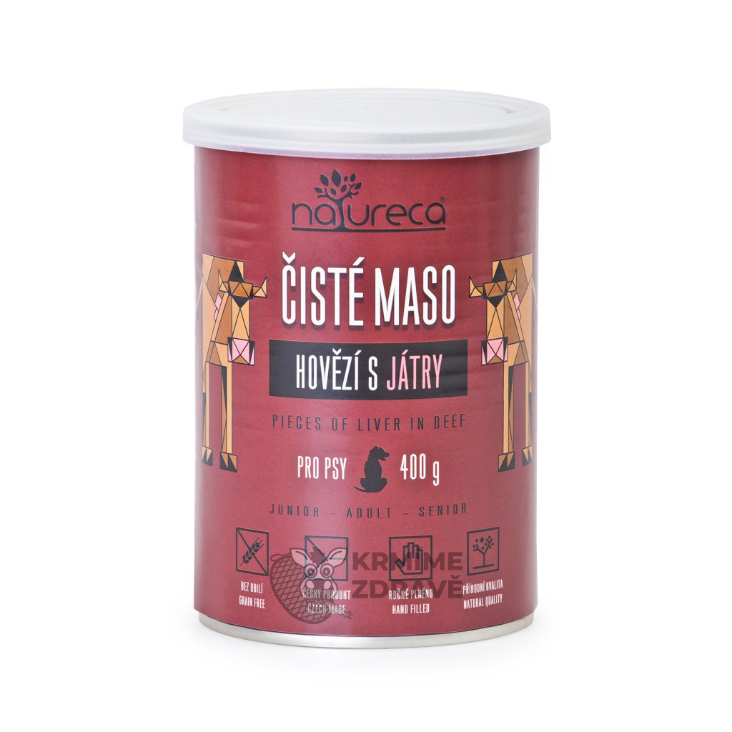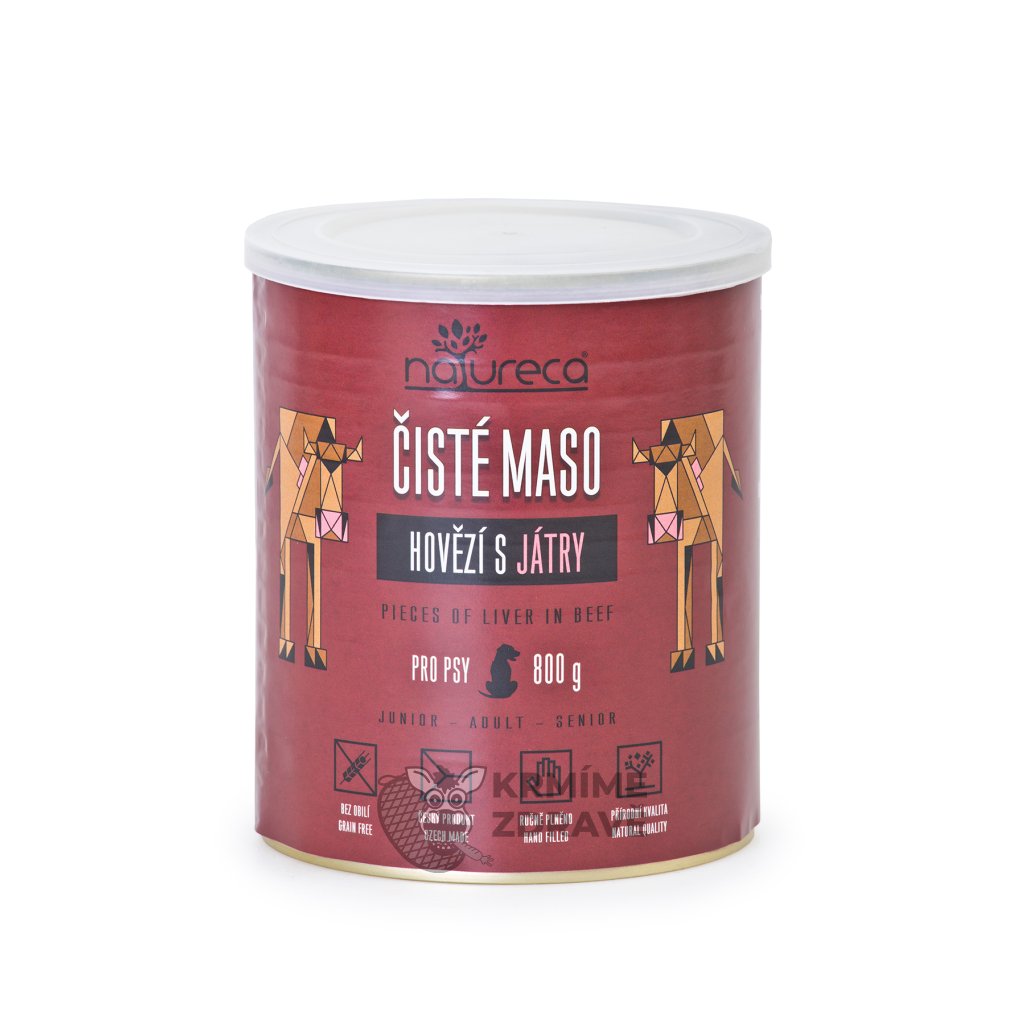 Konzerva Hovězí s játry je poctivá 100% masová pochoutka pro psy, vyrobená z kvalitního hovězího masa s podílem 30 % ručně vložených kusů jater. Zbylých 70 % tvoří hrubě mleté hovězí maso a droby, které jsou přirozeným zdrojem bílkovin, minerálů a vitamínů. Neobsahuje obiloviny, sóju, konzervanty ani umělá barviva. Játra dodávají krmivu intenzivní chuť a jsou bohatá na železo, zinek, selen a vitamíny skupiny B. Tato výživná konzerva podporuje imunitu, vitalitu a zdravou kondici psa. Vyrobeno v České republice pod stálým veterinárním dohledem.