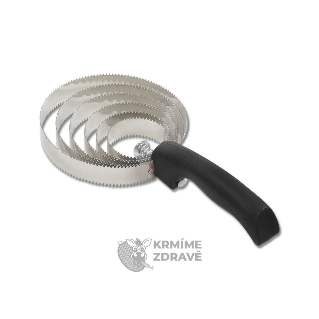 Kovové hřbílko se šesti kroužky z nerezové oceli s plastovou rukojetí.