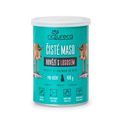 Hovězí s lososem pro kočky je 100% masová konzerva z kombinace hovězího masa a čerstvého lososa. Přírodní, výživná a chutná – bez obilovin, sóji a chemie. Vhodná pro všechny kočky.