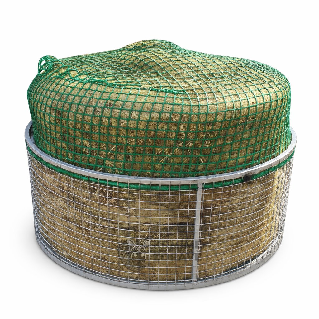 - výhodný komplet oblíbené sítě na seno s oky 4 x 4 cm z vysokopevnostního polypropylenu připevněné ke kruhovému příkrmišti na celý balík sena