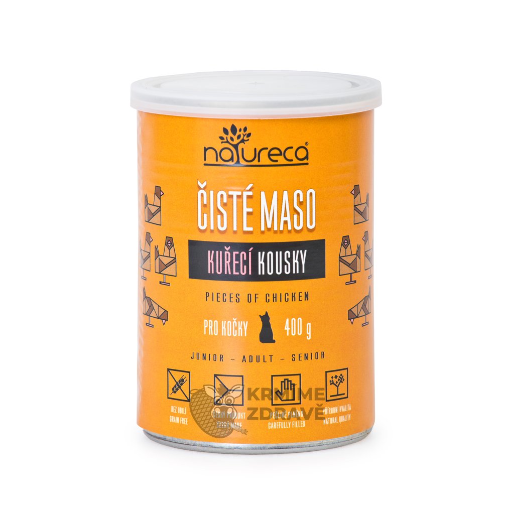 Konzerva Kuře kousky pro kočky 400 g je poctivé 100% masové krmivo vyrobené z nasekaných kousků kuřete i s kostmi, které jsou díky vysokému tlaku a teplotě při výrobě dokonale rozvařené. Konzerva je přirozeným zdrojem bílkovin, hořčíku, sodíku a vápníku – látek důležitých pro správnou funkci svalů, nervové soustavy a pevné kosti. Vysoký obsah bílkovin podporuje obranyschopnost, stavbu těla a vitalitu kočky. Neobsahuje obiloviny, sóju, chemikálie ani konzervanty, a je proto vhodná i pro kočky s citlivým trávením nebo dietním režimem. Vyrobeno v České republice pod státním veterinárním dozorem.