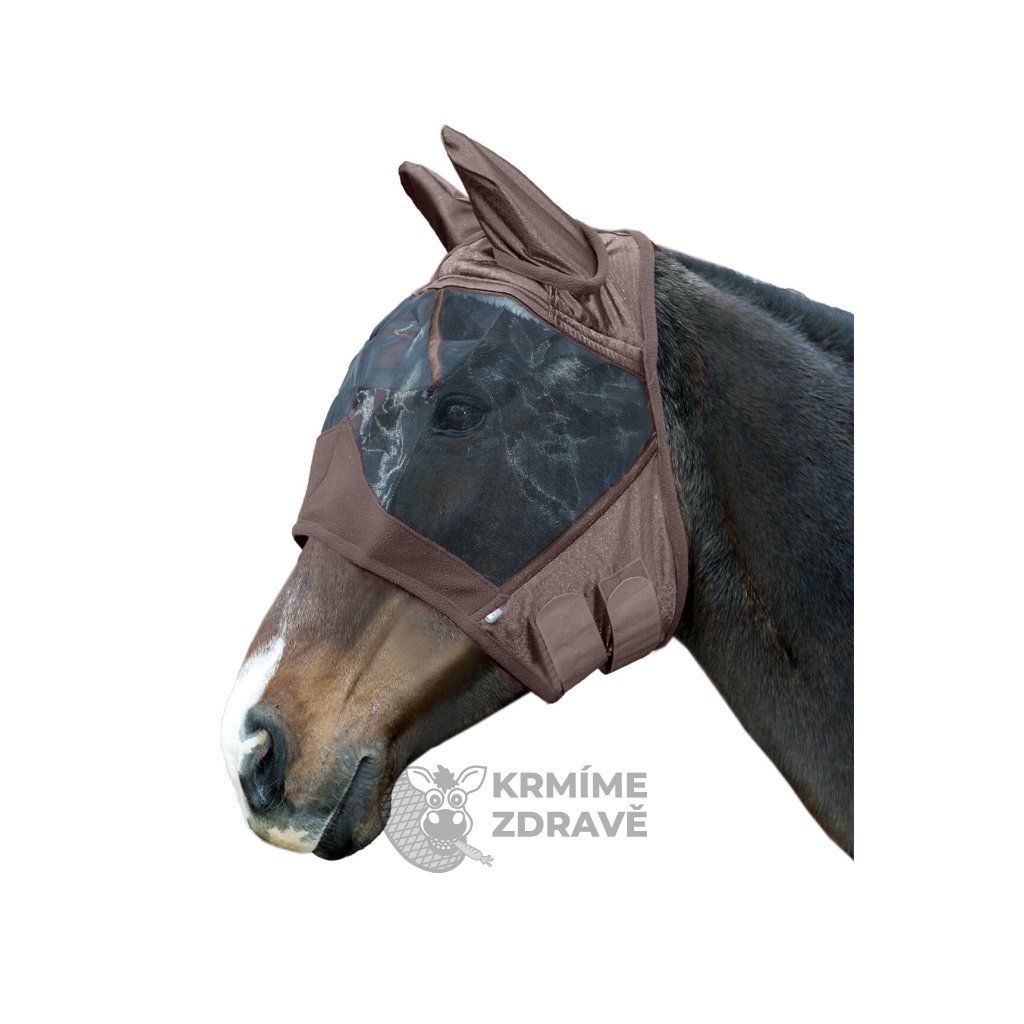 Kvalitní maska k ochraně koní proti mouchám a hmyzu, zapínání na dva suché zipy.