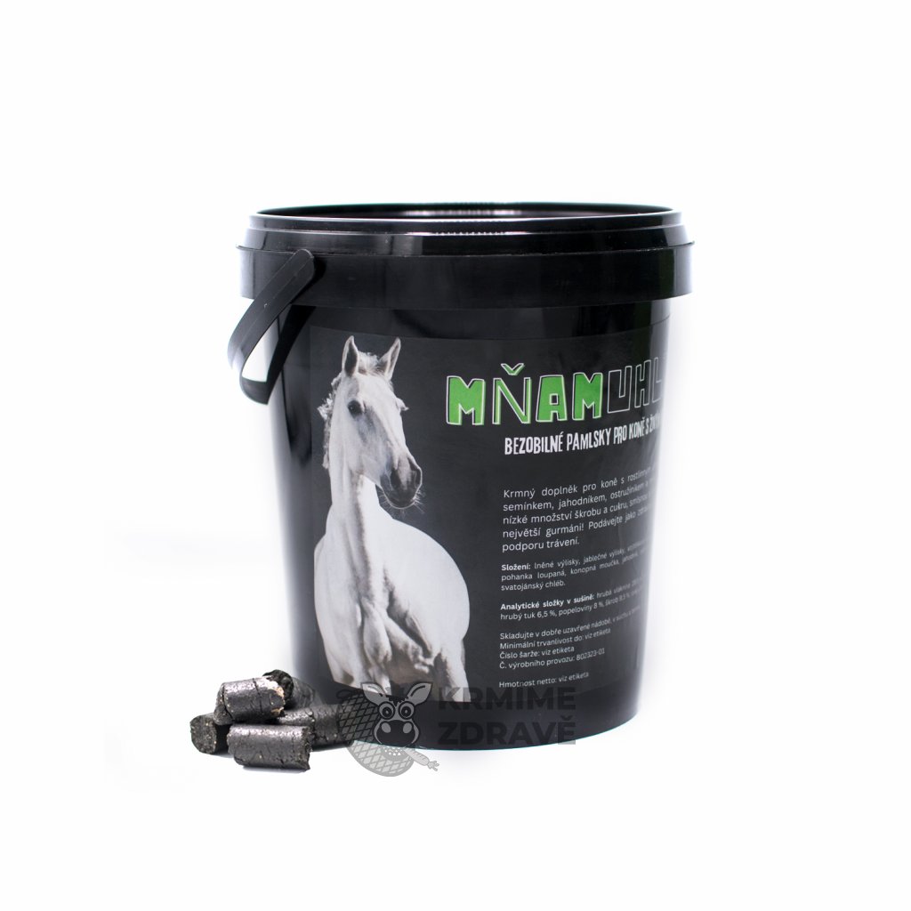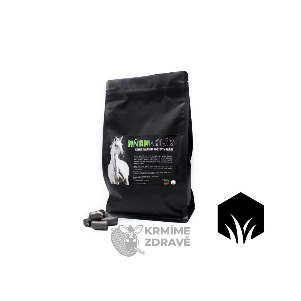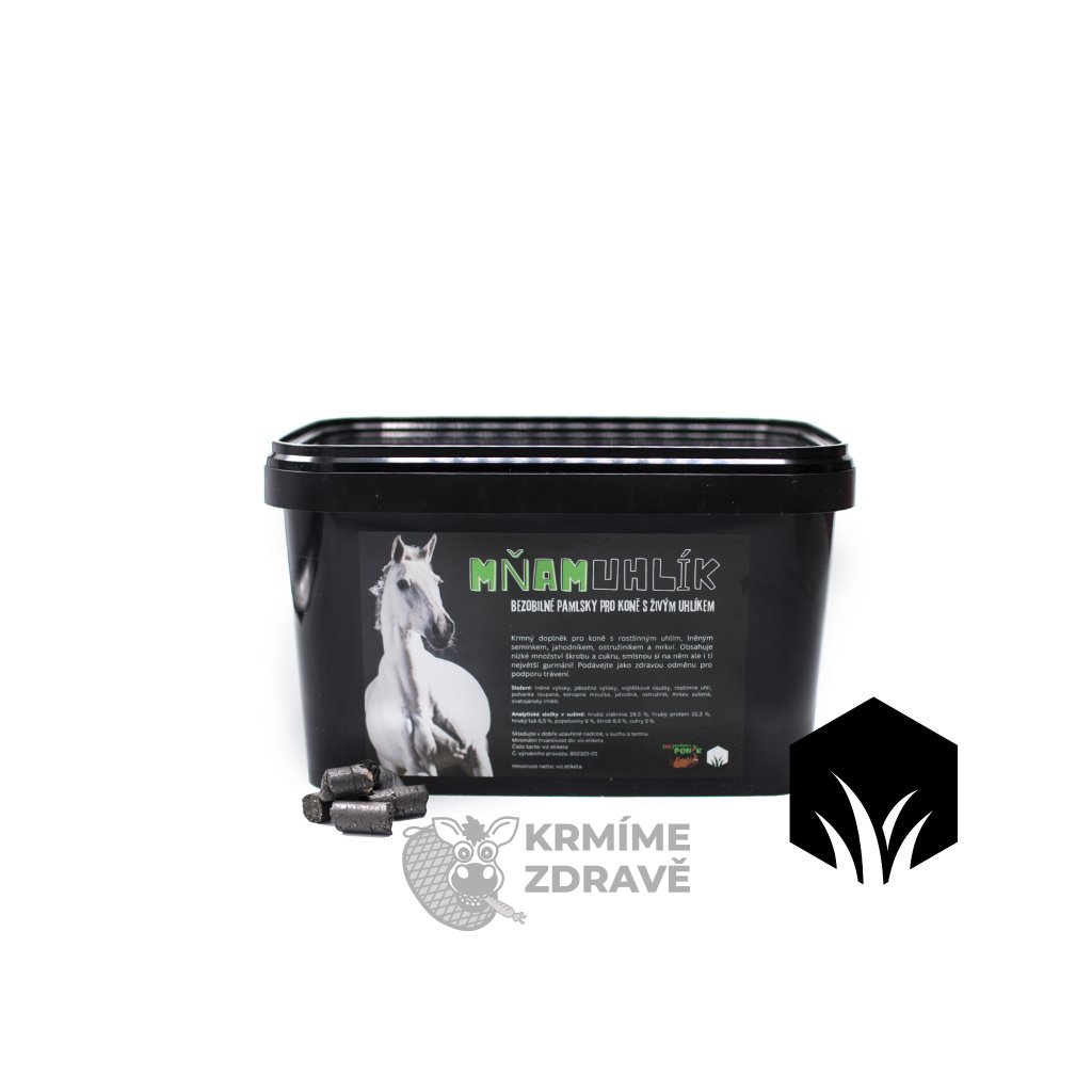 Do receptury jsme navíc přidali i konopné semínko, ostružiník, maliník, pohanku, karob a mrkev. MňamUhlík je mlska s nízkým obsahem škrobu a cukrů, kterou můžete podávat jako odměnu nebo jen tak pro podporu trávicího traktu Vašeho koňského parťáka. Pamlsek není tvrdý a dobře se kouše, má formu válečků o průměru 10 mm.