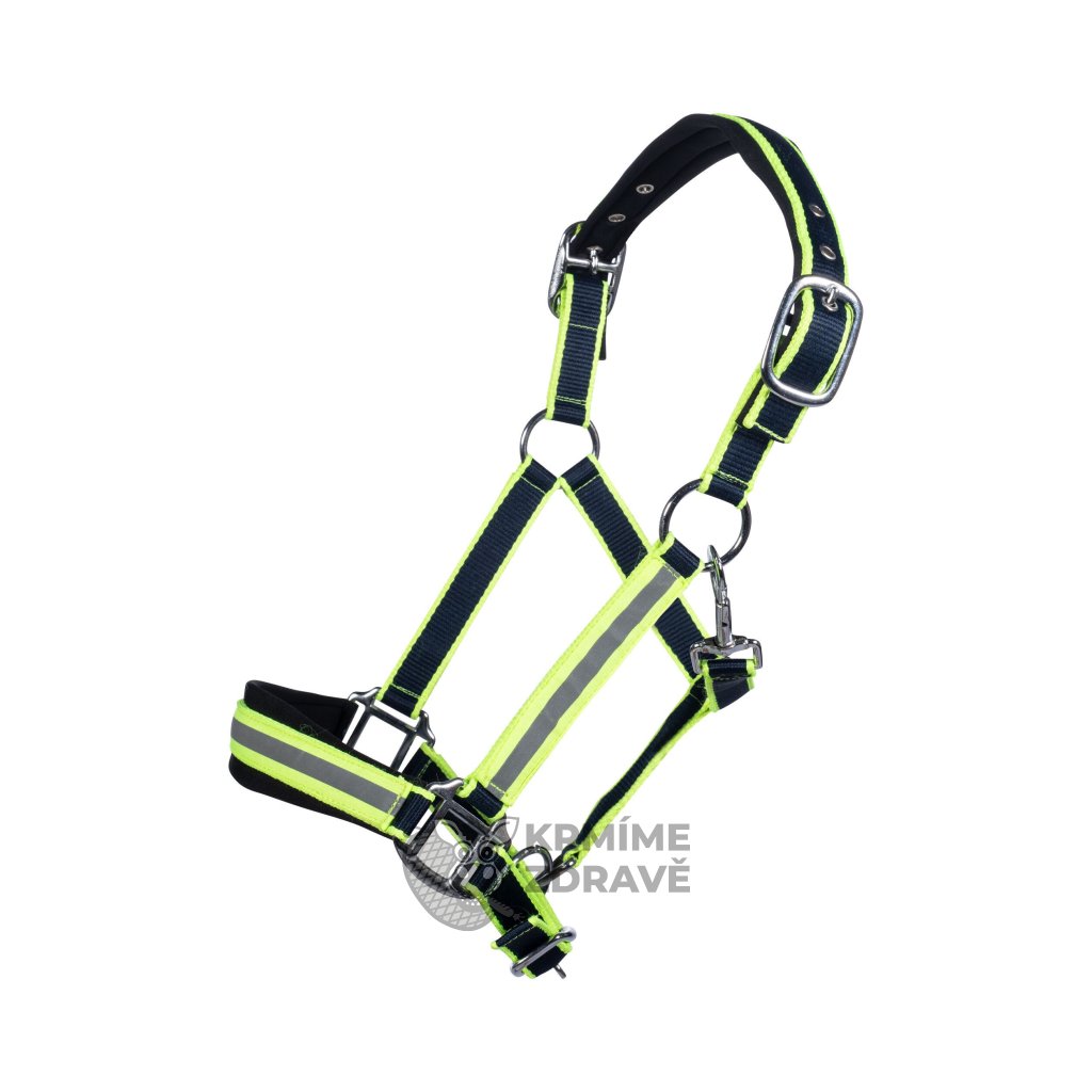 Reflexní ohlávka s měkkým polstrováním z neoprenu zajišťuje pohodlí i bezpečnost koně díky reflexním prvkům a pevným kovovým přezkám.
