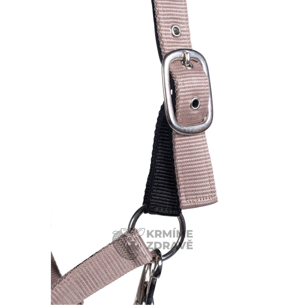 Stájová ohlávka s integrovaným bezpečnostním zapínáním na suchý zip pod kovovým zapínáním.