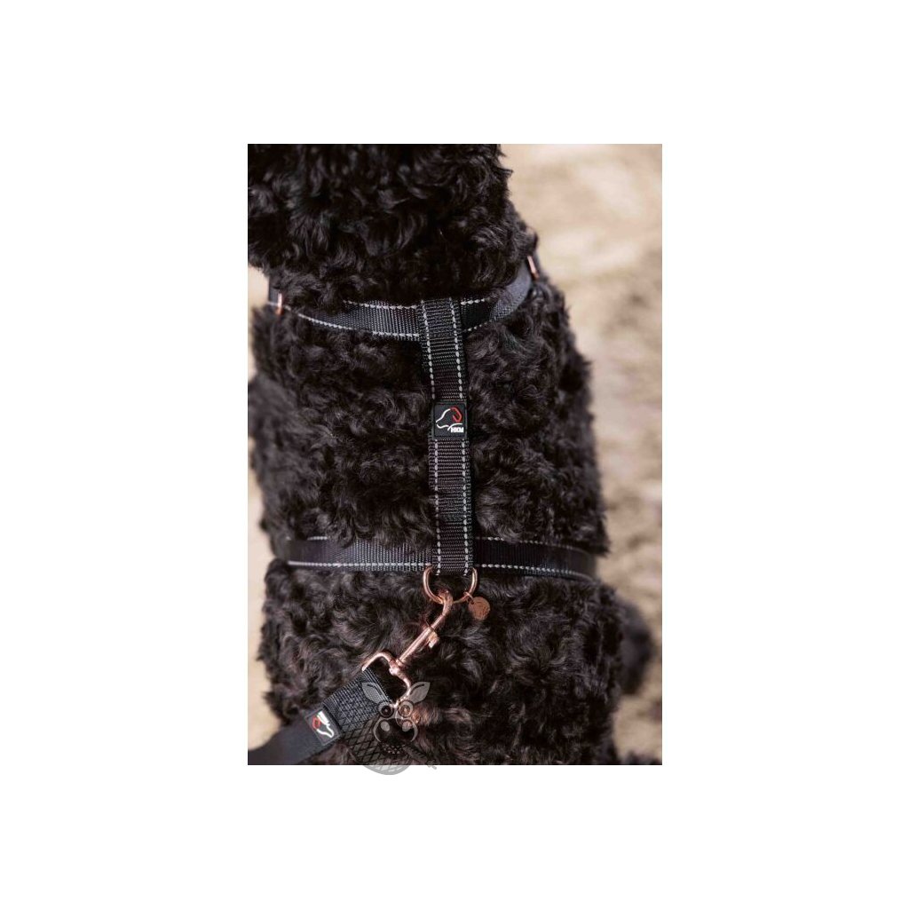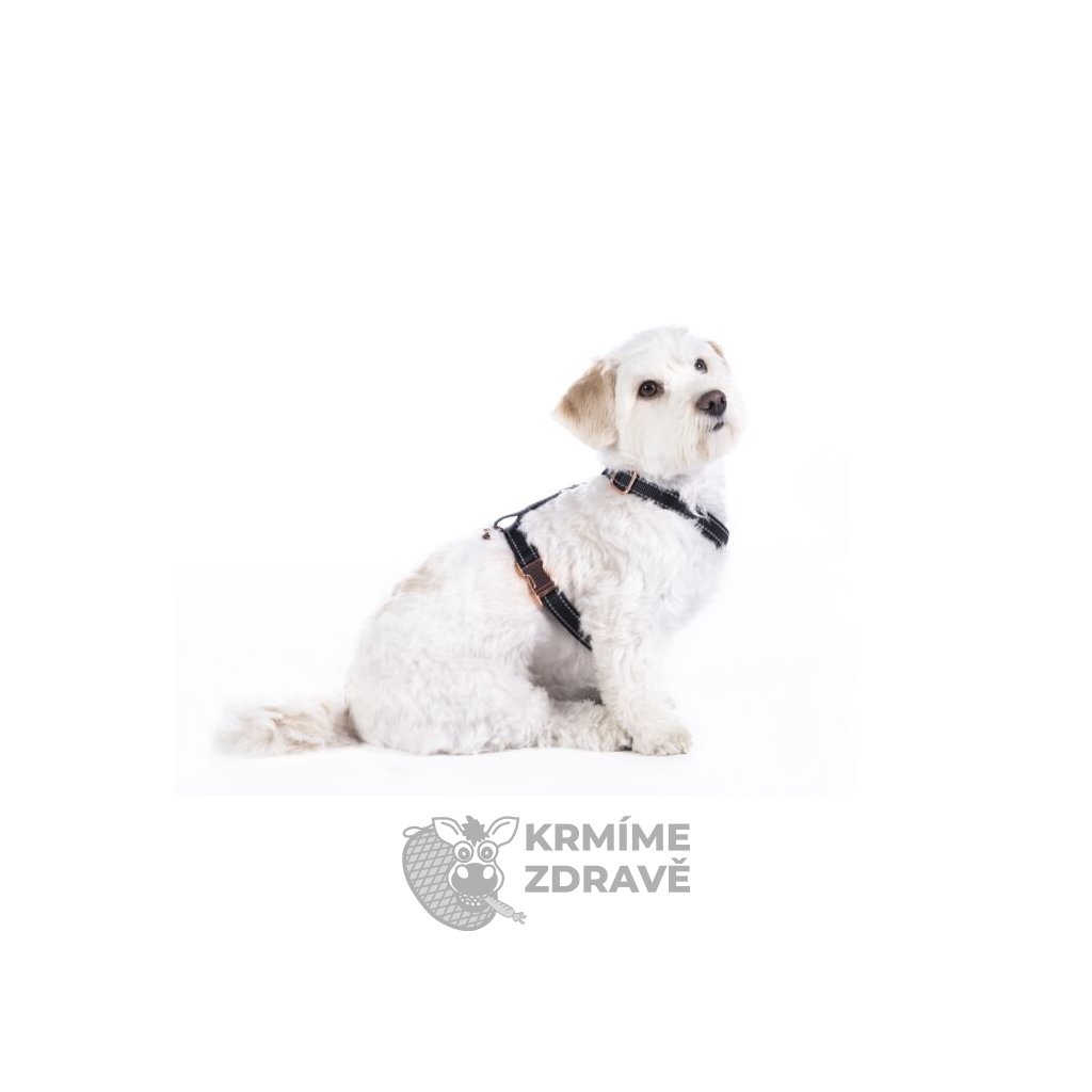 Postroj pro psy Anam Cara Basic Černá/Rosegold je vyroben z pevného a přitom příjemně měkkého nylonu, který je komfortní na nošení a snadno se udržuje. Reflexní švy zajišťují vyšší bezpečnost při procházkách za šera i ve tmě. Díky plynule nastavitelným popruhům se postroj dokonale přizpůsobí tvaru těla psa a zajistí pohodlí i volný pohyb. Robustní kovový D-kroužek poskytuje spolehlivé uchycení vodítka.
