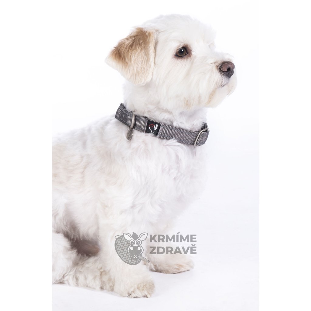 Stylový psí obojek Anam Cara v šedé barvě, reflexními prvky a měkkým podložením pro pohodlné a bezpečné nošení.