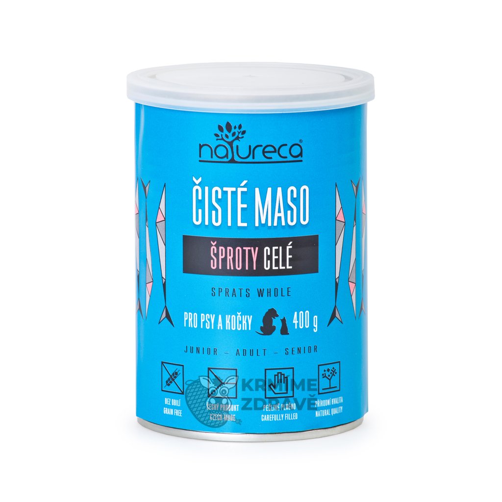 Konzerva Šproty celé pro psy a kočky 400 g je přírodní 100% masové krmivo z celých mořských ryb, které jsou mimořádným zdrojem bílkovin, jódu, minerálů a vitamínů A, B a D. Rybí tuk bohatý na omega-3 mastné kyseliny podporuje zdraví srdce, mozku i kloubů, zlepšuje kvalitu srsti a kůže. Díky přirozenému složení bez obilovin, sóji, barviv a konzervantů je tato konzerva vhodná i pro citlivé jedince. Vhodná pro všechny plemena a věkové kategorie psů i koček. Vyrobeno v České republice pod stálým veterinárním dozorem.